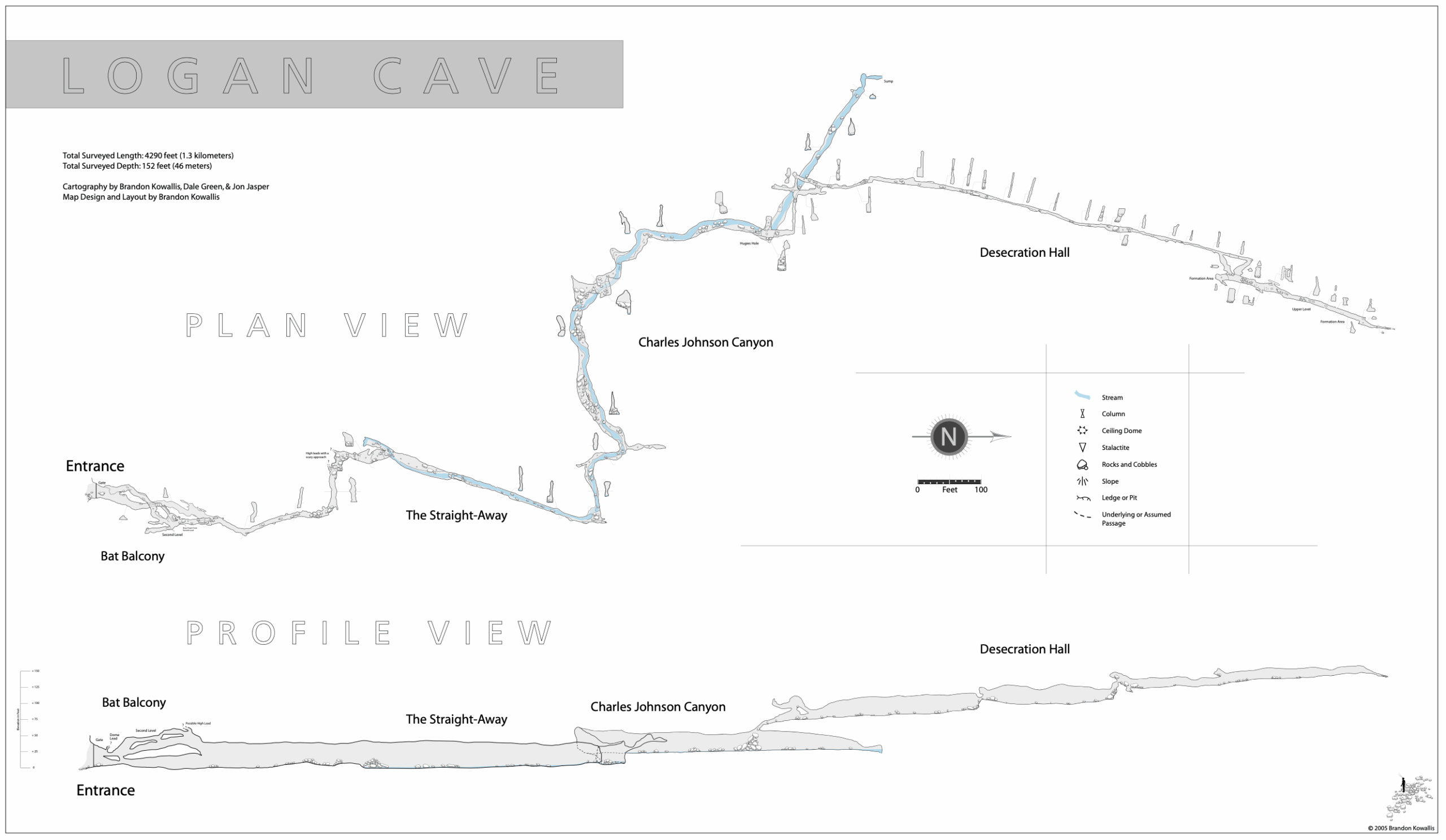 Downloadable, high resolution, printable PDF file of the 2005 Logan Cave Map, © 2005 Brandon Kowallis. Surveyed by Dale Green, Jon Jasper, and Brandon Kowallis. Cartography by Brandon Kowallis.
