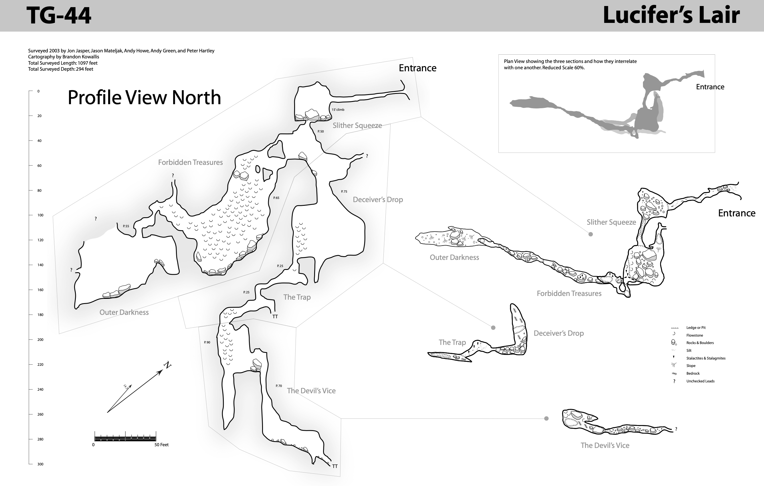 Downloadable, high resolution, printable PDF file of the 2003 Lucifer’s Lair Cave Map, © 2003 Brandon Kowallis. Surveyed by Jon Jasper, Peter Hartley, Andy Howe, Andy Green, and Jason Mateljak. Cartography by Brandon Kowallis.